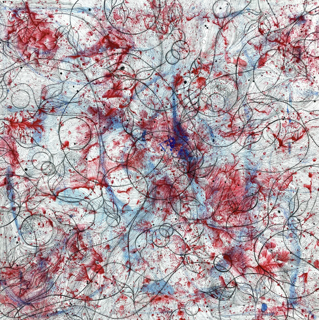 Since 2019 Roescheisen has explored the interplay of philosophy, music, and quantum physics. In the series Vibrational Strings, the artist presents her hypothesis of “emotional waves,” likening them to sound and magnetic waves, which connect individuals attuned to diverse frequencies that bind them together as “emitting poles” and “receiving poles.” The physicality of Roescheisen‘s creative process is integral, as her hand becomes a conduit for transmitting emotions onto the canvas. Time unfolds as Roescheisen‘s hand moves intuitively across the surface, gradually building layers with paint, earth’s minerals, and ink.