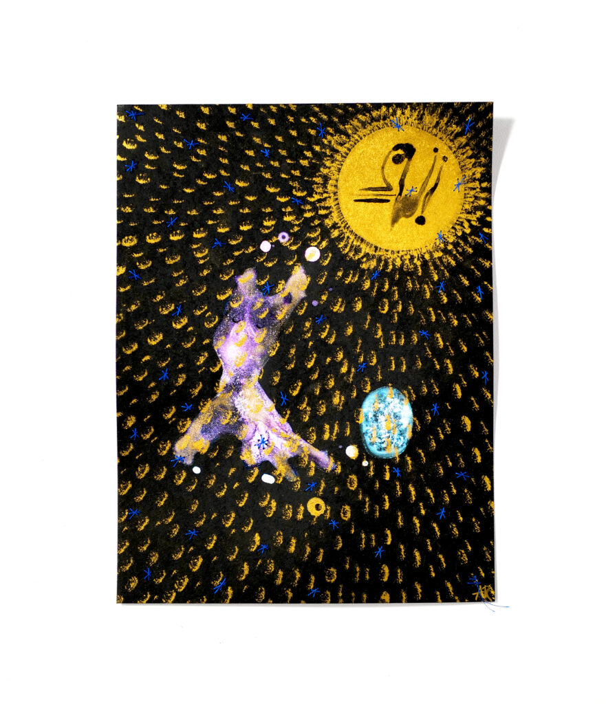 Technic Pigment, ink, yarn, acrylic, shell on paper