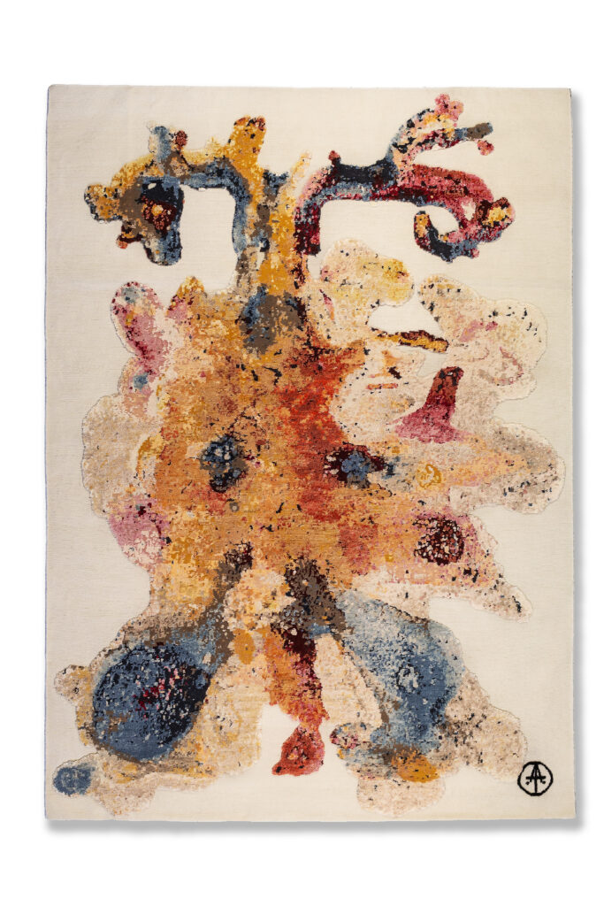 In Weaving Myths, Roescheisen transfers the myth of the dragon from her series of Dragon paintings to hand-woven and hand-dyed rugs, weaving her own myth, which she describes as “an age-old tale that whispers through the threads—a legend in a hidden realm, where elusive creatures known as Lumara weavers, who possess the mysterious ability to spin threads of imagination, re-connect spectators to their own innate knowledge of the existence of magic.” In this way, the artist also pays homage to the phantasmagorical content of The Lady and the Unicorn (c. 1500), a beloved medieval tapestry at Musée Cluny, Paris.